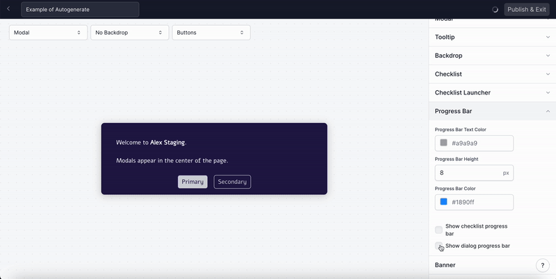 Yes, you can add navigation buttons without using a modal or tooltip by creating a Theme with a transparent dialog box and border.To create a Theme, visit Themes > + Create theme. From here, select Dialog > Dialog Background Color > use the opacity slider under the color picker to make the dialog box transparent. Repeat this step with the Dialog border color.Learn more about Themes.Can I add navigation buttons to my demo without using a Modal or Tooltip?