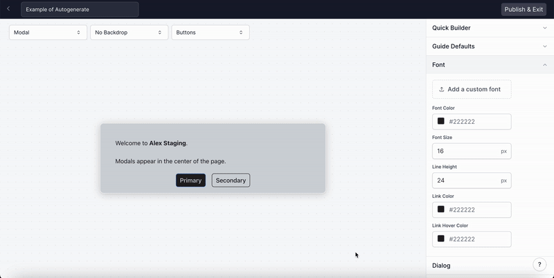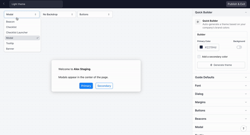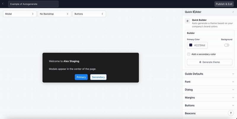 To autogenerate a Theme, go to Themes > Quick Builder. From here, you can choose a primary color and a secondary color > Click “Generate theme”. If you want one of the colors to be the default background color, toggle on “background”.These colors will automatically apply to all of the elements in Themes including buttons, beacons, tooltips, etc.